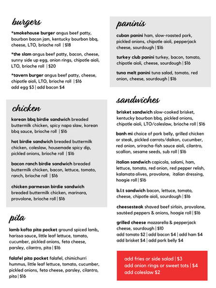 Weather permitting, the Tavern at Red Tail is open daily 9:30am to 7:00pm from April through November. Hours are subject to change based on course closures and private event buyouts. Reservations are recommended for parties larger than six (6) people.